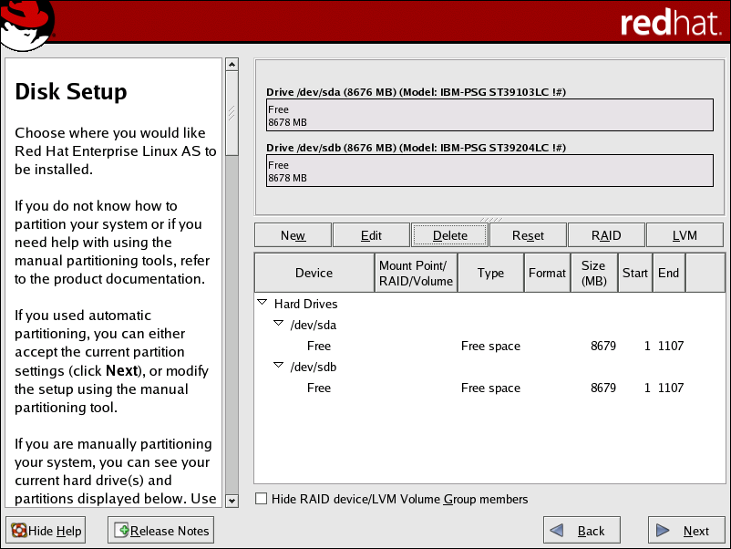 Although the following steps are illustrated during a GUI installation, the same can be done during a text-based installation. Configuration of software RAID must be done manually in Disk Druid during the installation process. |